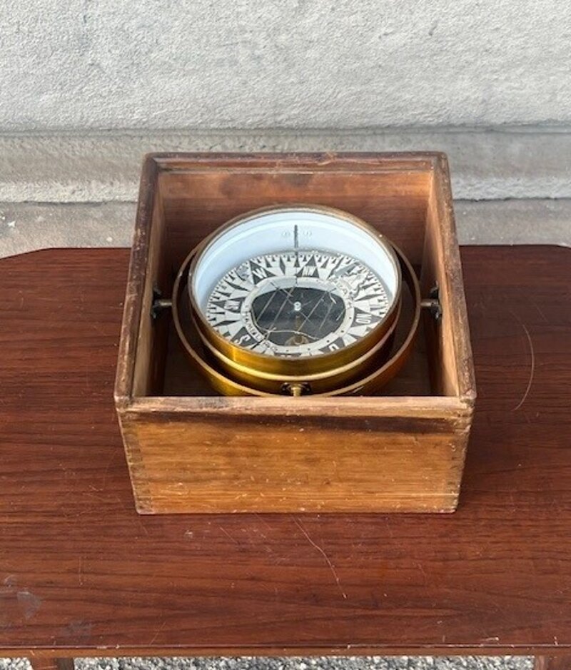 Rosa dei venti in carta su giunto cardanico in cassetta di legno con maniglie laterali in ottone.