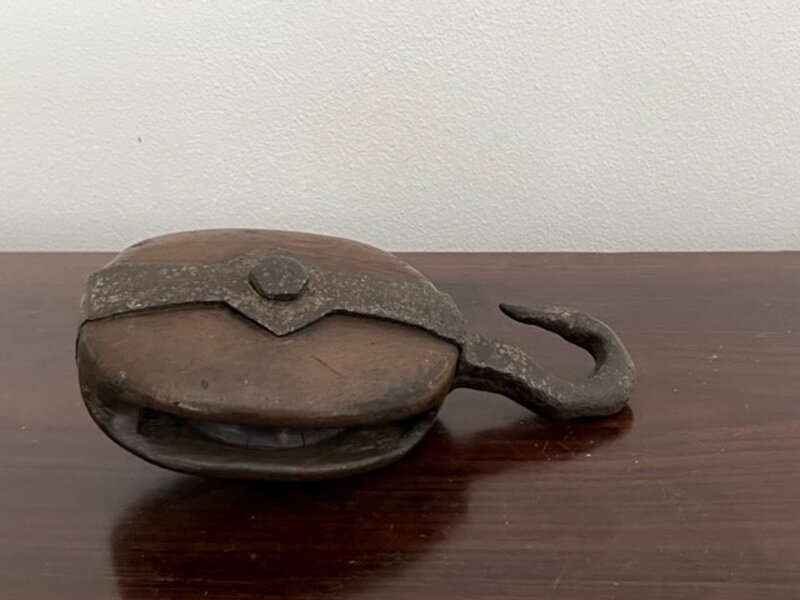 Bozzello navale antico in legno e ferro con puleggia in legno,