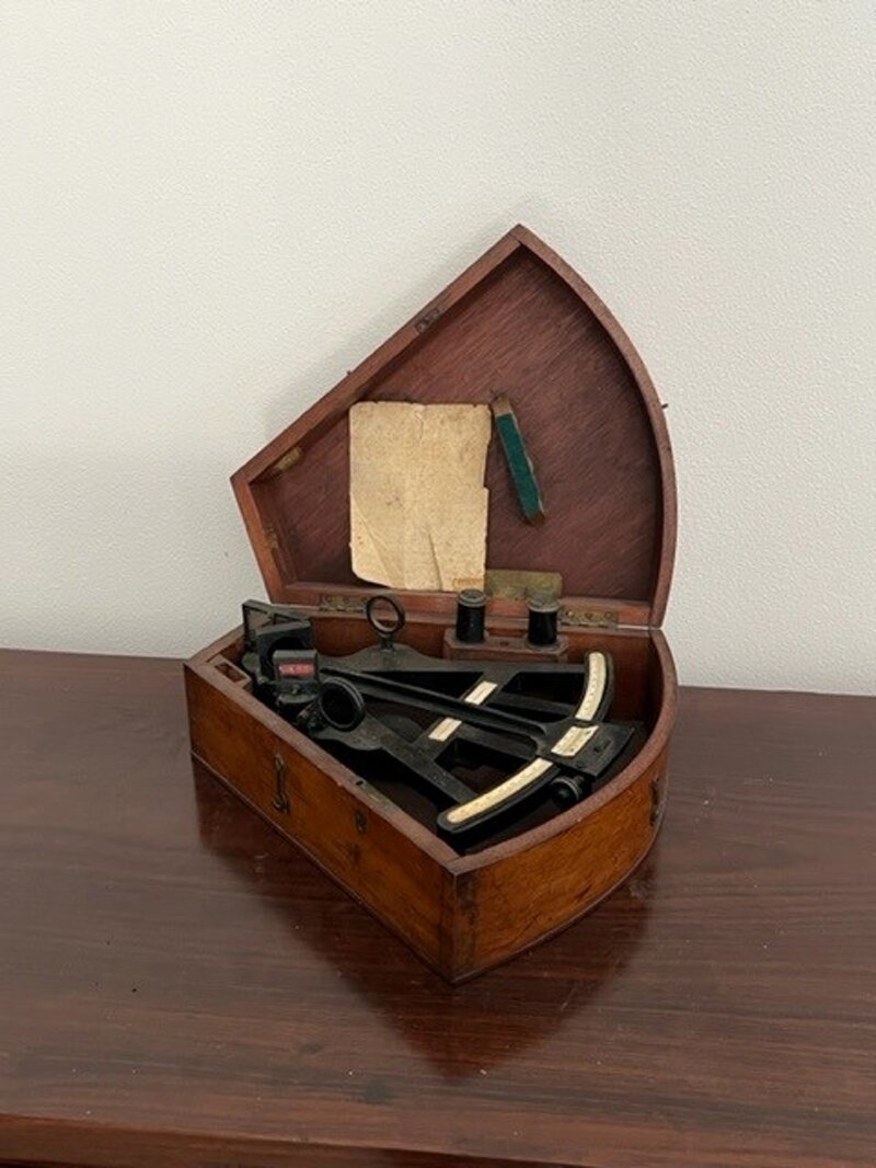 Ottante telaio in ebano, alidada in ottone, lembo e verniero in avorio, graduazione da -5° a 110°, tre vetri colorati per lo specchio.